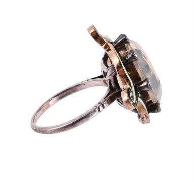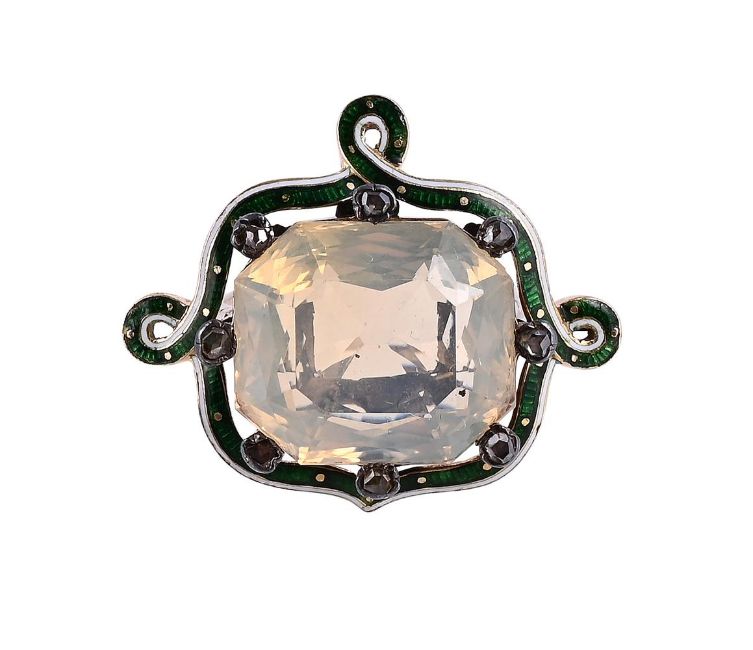 The octagonal cut quartz within a surround of rose cut diamonds, to a green and white enamelled looped border, to a later setting, unmarked
