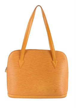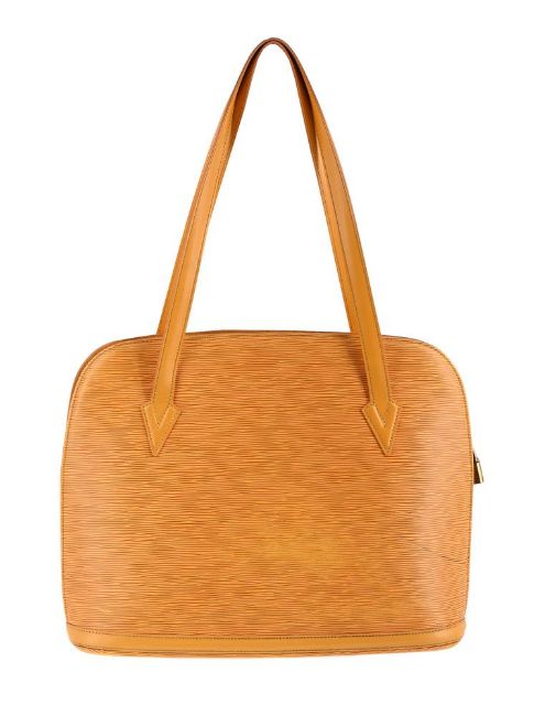 With twin leather loop handles, the zip fastener opening to a purple suede interior with a zipped and an open pocket