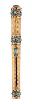 With engine turned decoration, inset with turquoise bands and thumb slide