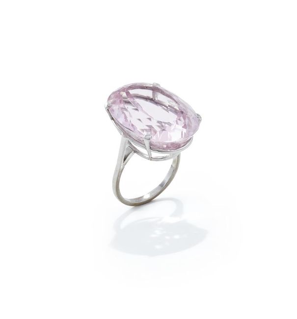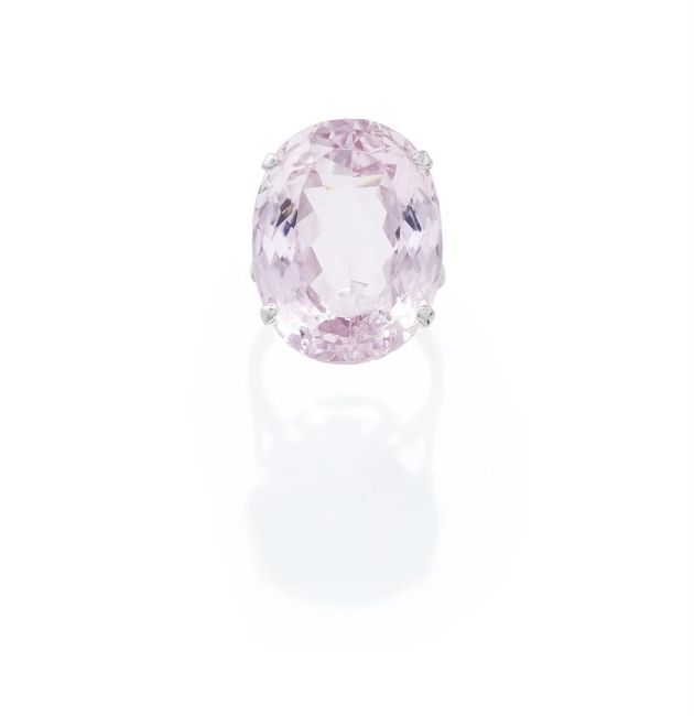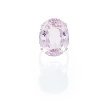 The oval cut kunzite in a four claw mount, kunzite weighing approximately 47.60 carats, later shank unmarked