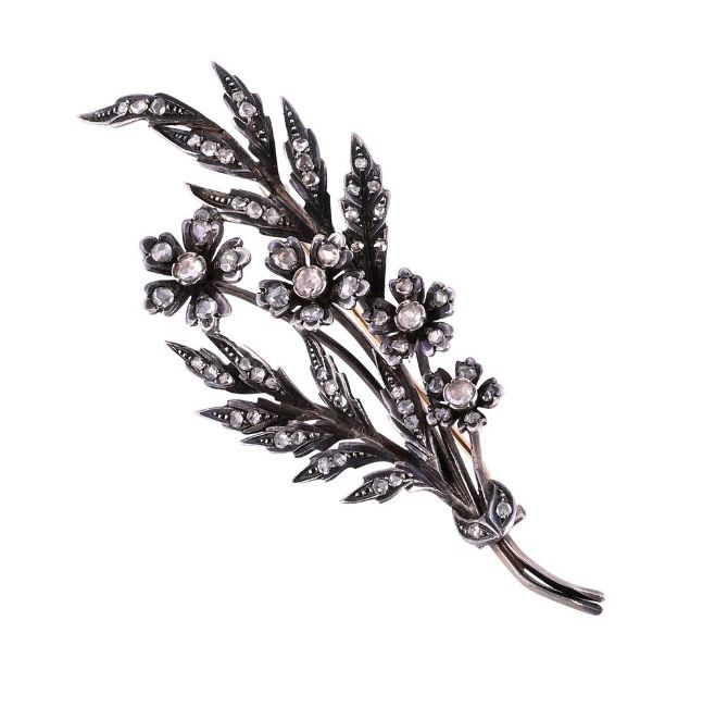 With four graduated rose cut diamond set flowerheads amongst rose cut diamond set foliage, unmarked