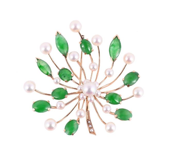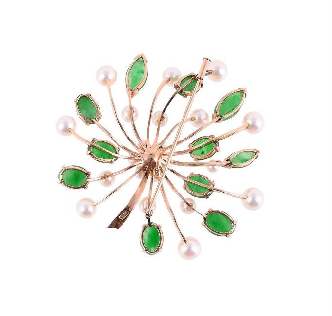 The brooch with a cultured pearl cluster to polished radiating bars with cultured pearl and oval and marquise shaped cabochon jadeite jade, stamped K14