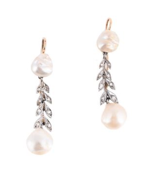 Each blister pearl drop suspended from a foliate connector set with diamond points, to a blister pearl surmount, hook fittings, unmarked