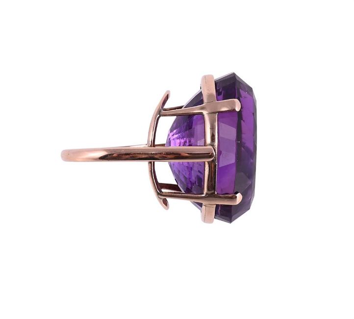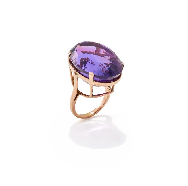 The oval cut amethyst in a high four claw mount, amethyst weighing approximately 56.0 carats, unmarked