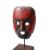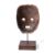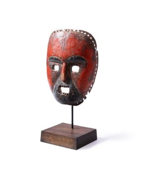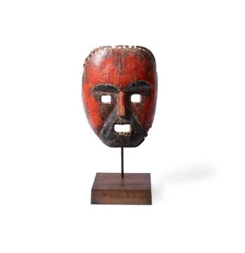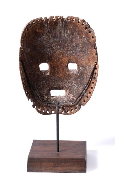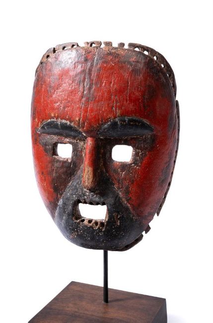 The rounded face with rectangular open mouth and eyes, reddish brown patina, holes for attachment of a fibre costume (now missing) and teeth
