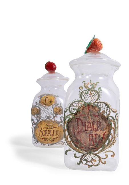 A SET OF THREE ITALIAN GLASS STORAGE OR SHOP DISPLAY JARS AND COVERS