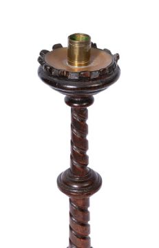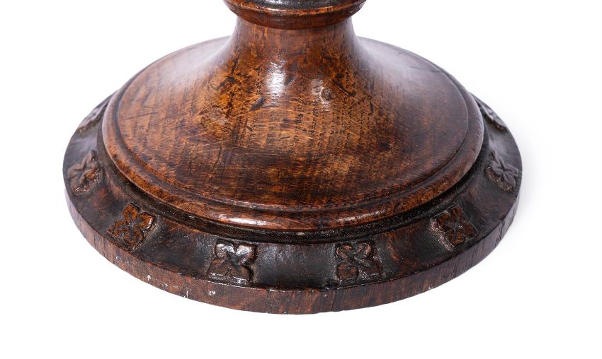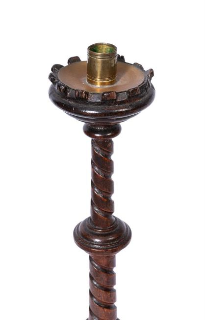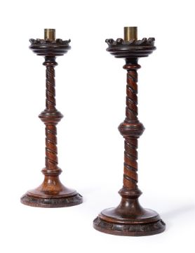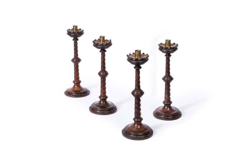 A SET OF FOUR VICTORIAN OAK GOTHIC REVIVAL CANDLESTICKS