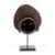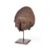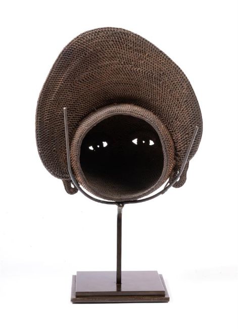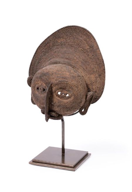 Made of woven fibres representing a stylised face under a crested coiffure, encrusted patina