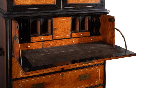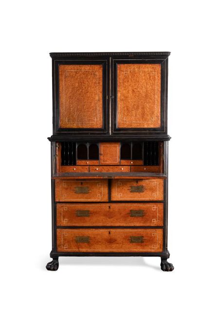 The upper section enclosing two shelves and two drawers, the secretaire with a fitted interior of drawers and pigeon holes, and with two short and two long drawers below on lion paw feet, with brass handles to the sides and ivory line inlay throughout
