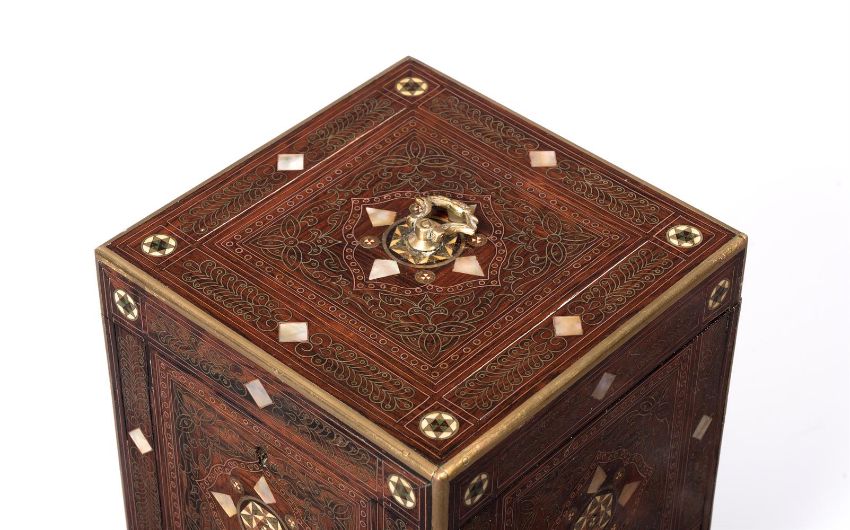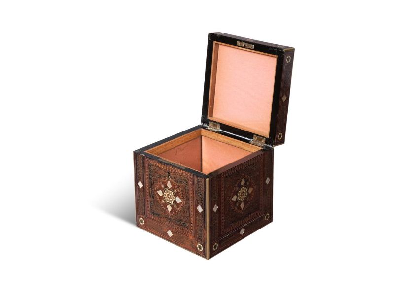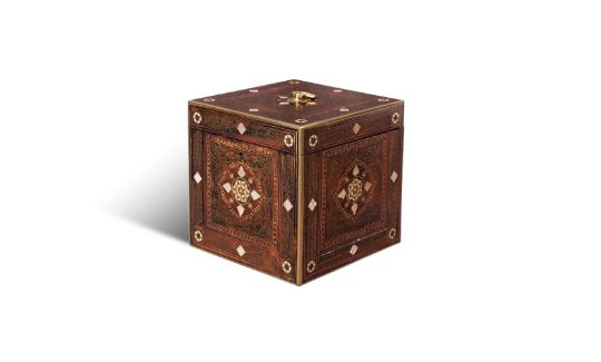 Y A MOORISH INLAID WALNUT CUBE TEA CADDY