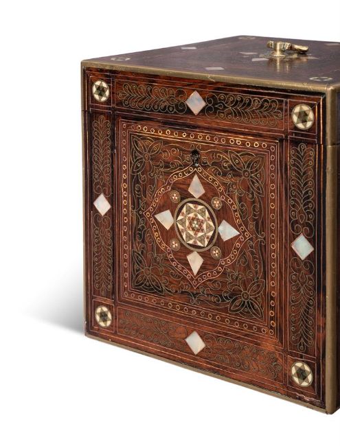 Inlaid with brass, mother of pearl, copper and ivory with parquetry designs and scrolling leaves and flowers, the hinged cover enclosing a glass lined vacant interior