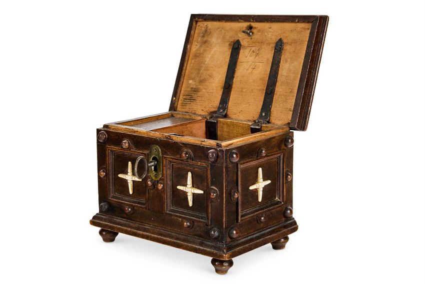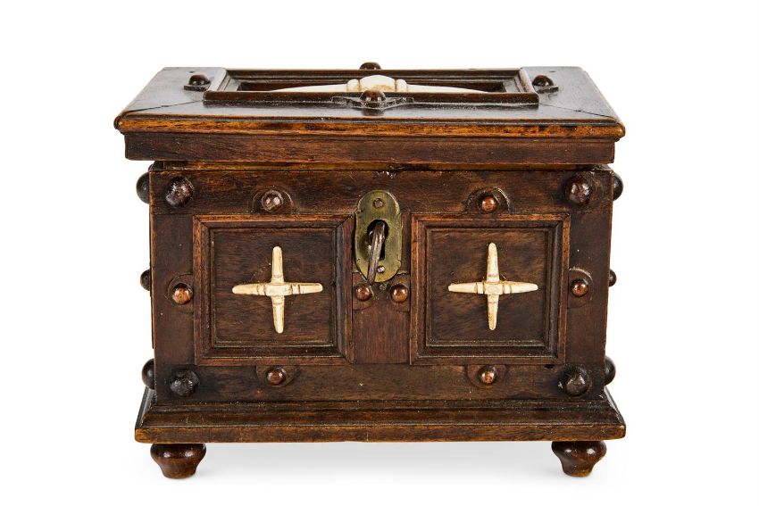 A SMALL BONE MOUNTED WALNUT TABLE CASKET