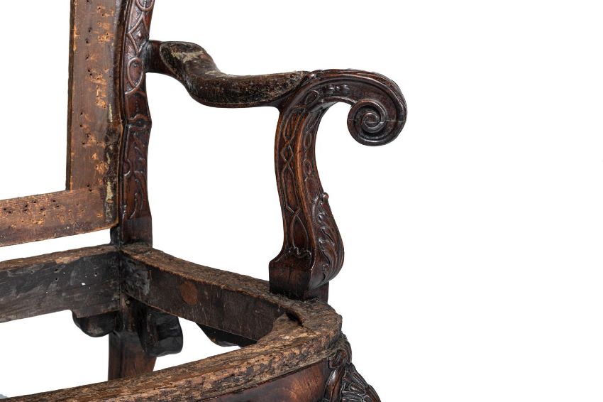 Seat frame partly upholstered, top of seat rail unavailable to see but in all likelihood showing some signs of woodworm activity