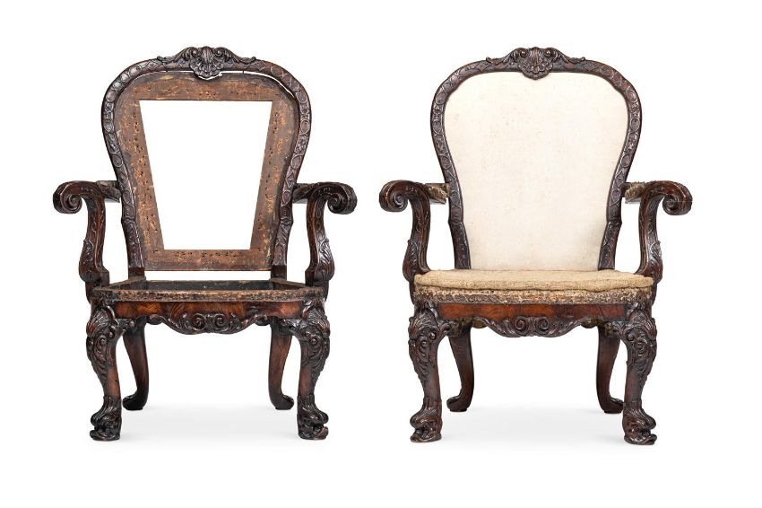 A PAIR OF CARVED WALNUT ARMCHAIRS IN GEORGE II STYLE, POSSIBLE INCORPORATING SOME PERIOD ELEMENTS