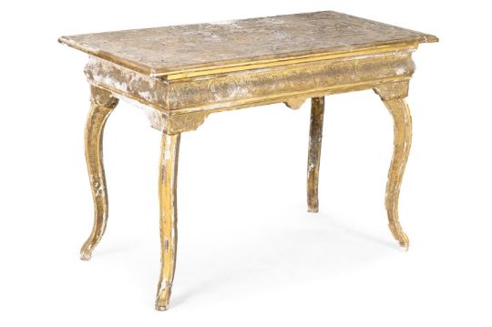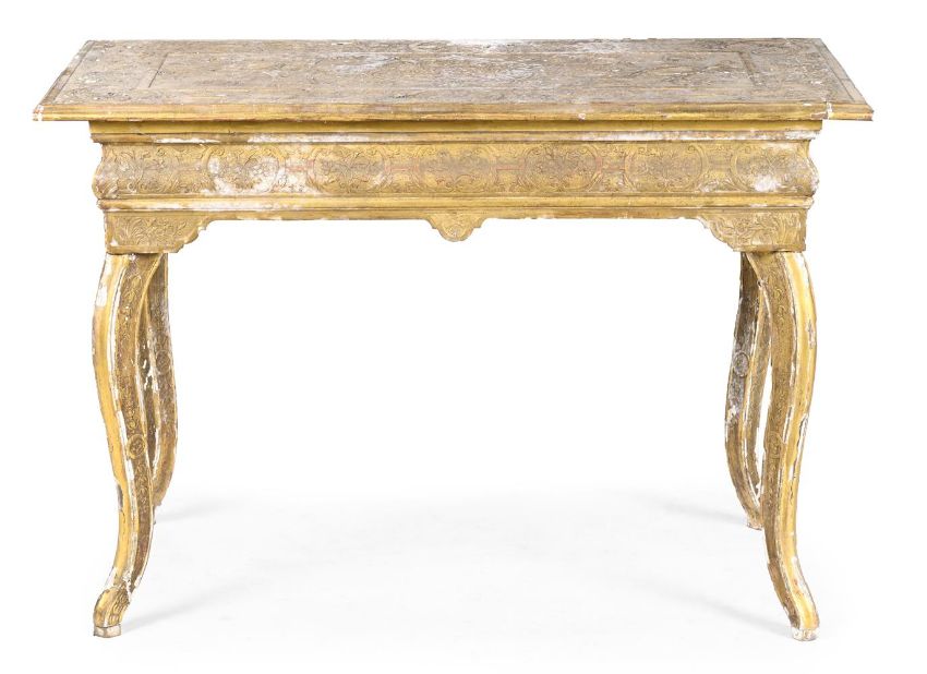 The legs carved with pendant husks, the carved gilt gesso top centred with a monogram or cypher within a cartouche
