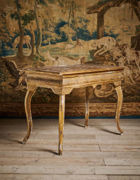Carved gilt gesso tables of this type demonstrate high status of the original owner, and the present lot is enhanced by the presence of a monogram or cypher (entwined Cs, X & A?) within a garter inspired cartouche, which relates to tops for tables made, for example, for the Privy Chamber in the King's apartments at Kensington and the Duke of Marlborough for Blenheim - see Bowett, Adam, Early Georgian Furniture 1715-1740, Antique Collectors' Club, 2009, p201, pl.5:1. For an example of a carved gilt gesso table with entwined 'C' cypher, thought to be supplied by James Moore for the Duke of Chandos, see Murdoch, Tessa, The King's cabinet maker: the giltwood furniture of James Moore the Elder, The Burlington Magazine, June 2003, p417, fig 22.