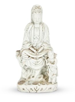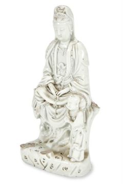 A DEHUA FIGURE OF GUANYIN 17TH CENTURY 35.5cm high     Condition Report: Dehua guanyin with four attendants missing and firing flawsFamille rose guanyin with Long crack through the base extending to the lower half of the figure, finger tips broken and one little finger missing on one hand, Chip to the flower  Condition Report Disclaimer