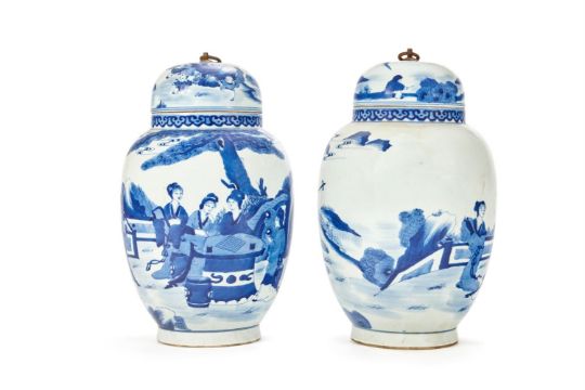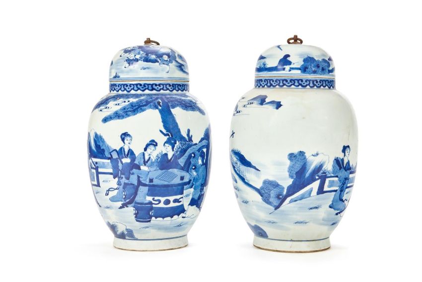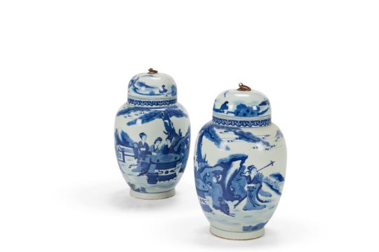 A PAIR OF BLUE AND WHITE PORCELAIN VASES AND COVERS IN KANGXI STYLE CHINESE, 20TH CENTURY Kangxi-style mark to the base 33cm high Condition Report: water stains to the interior, finials corrodedCondition Report Disclaimer