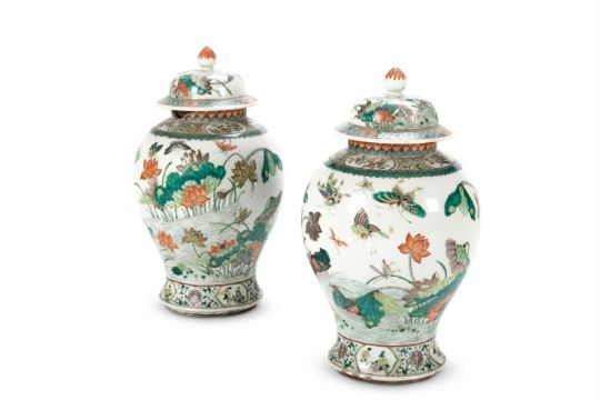 A PAIR OF FAMILLE VERTE PORCELAIN BALUSTER JARS AND COVERS CHINESE, LATE 19TH OR EARLY 20TH CENTURY Decorated with flowering aquatic plants, 42cm high Condition Report: Chips and losses. Please see additional images available from the Dept. upon request where this should be self explanatory. Condition Report Disclaimer