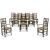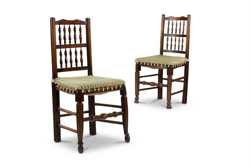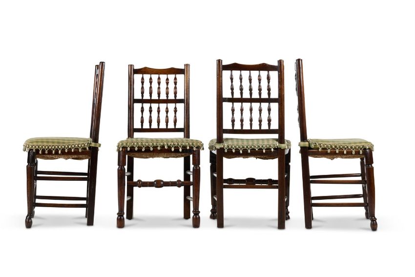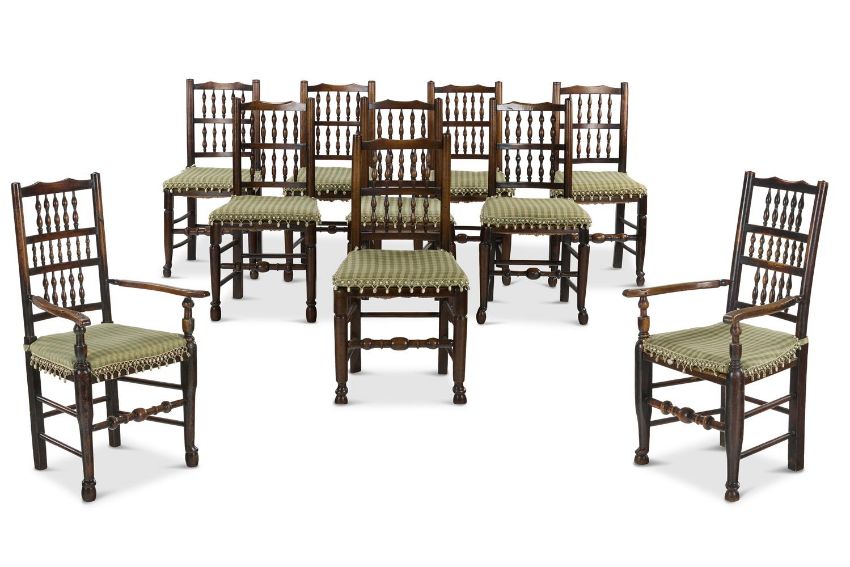 A MATCHED SET OF TEN ASH AND BEECH SPINDLE BACK DINING CHAIRS ENGLISH, FIVE LATE 18TH/EARLY 19TH CENTURY, AND FIVE LATER Including two armchairs, each with spindle-turned back and rush seat, with green check squab cushions The armchairs - 111cm high, 63cm wide, 45cm deepProvenance: Eight chairs acquired from Paul Hopwell, West Haddon, Northants, 4 March 1989, by the present owner Condition Report: Good, structurally secure, with wear and tear and shrinkage due to age and use. There are dents marks and scratches throughout but all the chairs are of good colour and patina. The rush seats are all in god order and stable. The padded cushions clean and with barely any wear. As noted this is a matched set, assembled from unrelated chairs or sets of chairs, so by definition there are minor differences in detail and dimensions. There are differences in the timbers, so for example some toprails are made of ash, others of beech, and likewise with the turned spindles. There are minor differences in the shaping of the nipple finials, toprails, arms, legs and stretchers and there are distinct differences to the feet. On the other hand a surviving pure set of ten chairs would be scarce and would attract a premium price. The measurements given in the catalogue are for the armchairs, the side chairs measure 95cm high, 46 - 48cm wide (front edge of seat), 39 - 40cm deep. The height from the top of seat to the top of the chair back is - armchairs 67cm, side chairs 51cm. Condition Report Disclaimer