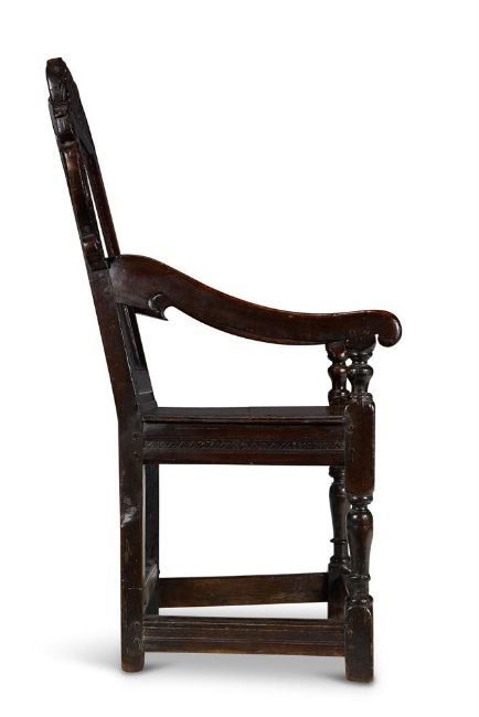 A CHARLES II CARVED OAK JOINED ARMCHAIR NOTHERN ENGLAND, PROBABLY YORKSHIRE, MID 17TH CENTURY The arched and scrolled crest rail carved with foliage above a foliate lozenge-centred back and solid seat, on turned legs joined by channelled box stretchers 114cm high, 60cm wide, 64cm deep The combination of distinctive features of the chair including the diamond carved back and shaped cresting are strongly indicative of furniture from the West Riding of Yorkshire, see Victor Chinnery, Oak Furniture, The British Tradition, Woodbridge, 2000, p. 468, and a similar chair ill' p.470, fig. 4:116, the latter possibly specifically from Leeds.
