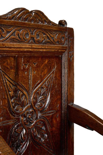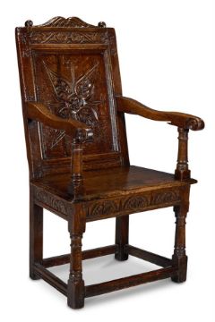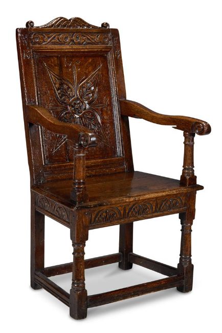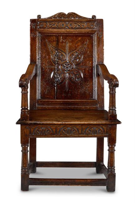 A COMMONWEALTH OAK JOINED ARMCHAIR PROBABLY SOMERSET OR GLOUCESTERSHIRE, DATED 1656 The shaped cresting rail and panelled back centred by a quatrefoil, dated 1656 and initialled 'WF' above a solid seat and lunette-carved seat rail, on turned legs joined by box stretchers 110cm high, 59cm wide, 60cm deep Provenance: Acquired from William H. Stokes, Cirencester, 18 October 1999 by the present owner.