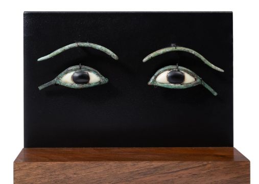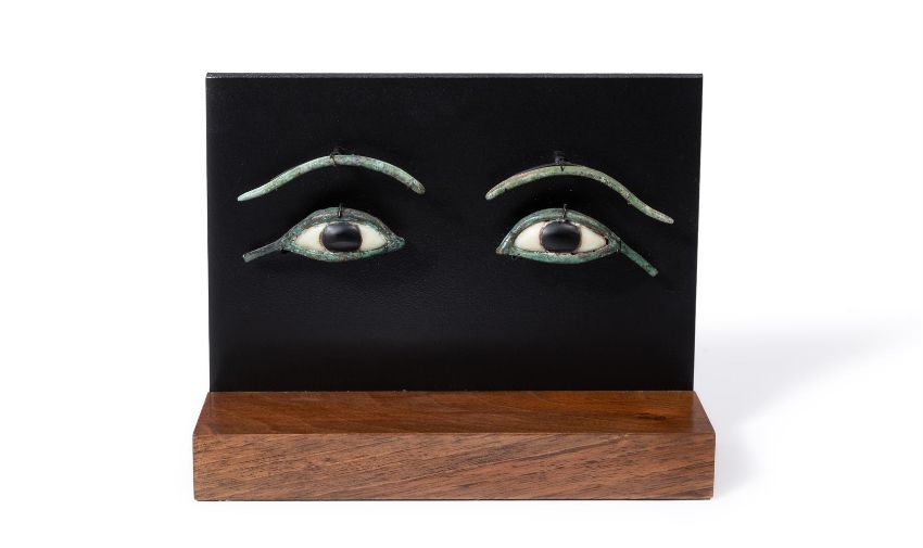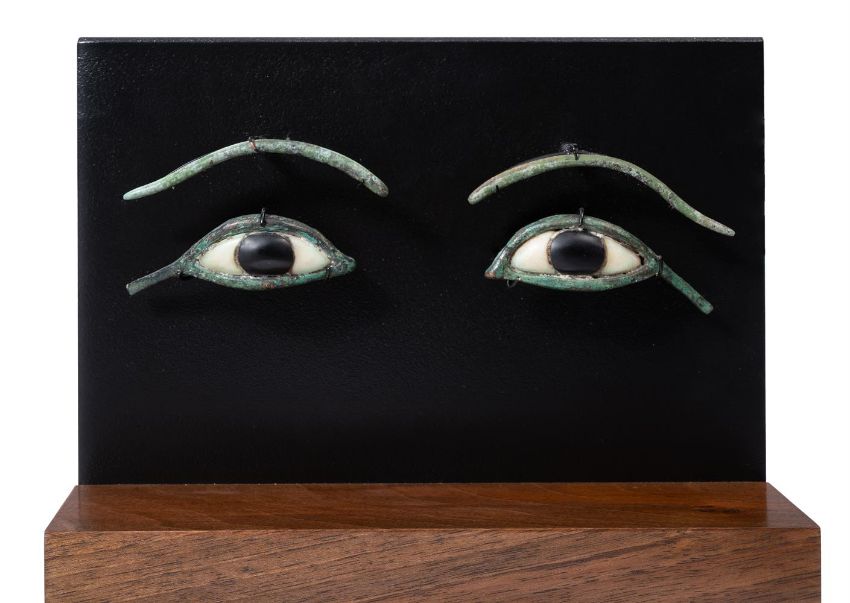 The slender arched bronze eye rims with extended cosmetic lines, inlaid with alabaster sclera with black irises, framed by undulating curved bronze eyebrows