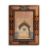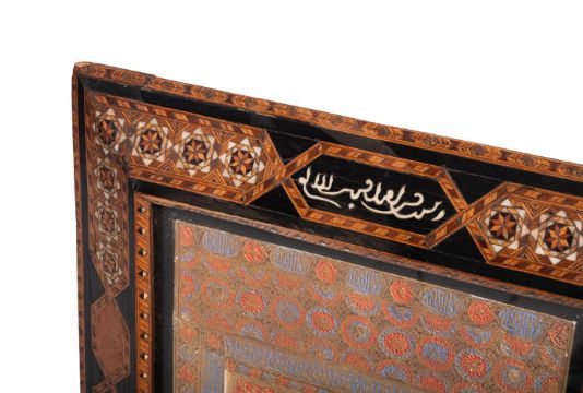 Approximately one twelfth scale model, plaster, with marble applied decoration and painted surround, depicting an archway door inset with hand tinted photograph if interior view, set in a marquetry and calligraphy inlaid frame with ivory
