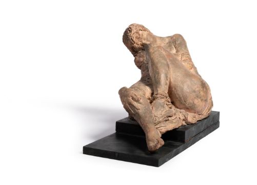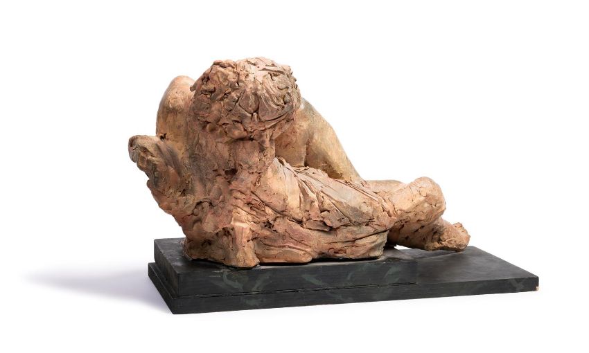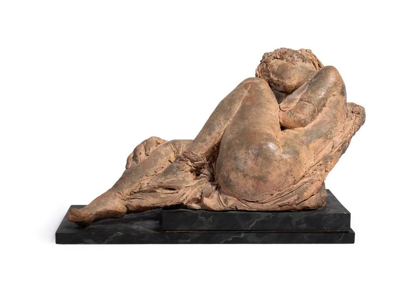 A LARGE TERRACOTTA FIGURE OF A RECLINING NUDE WOMAN