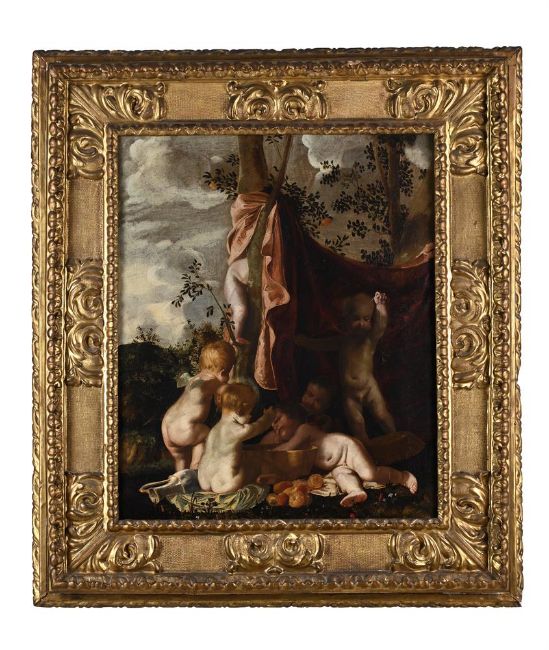FOLLOWER OF NICOLAS POUSSIN PUTTI PLAYING IN A LANDSCAPE Oil on canvas 84 x 70cm (33 x 27½ in.) Condition Report: The canvas has been relined. UV light reveals scattered retouching throughout, most notably to the sides of the canvas, where vertical retouches cover most of the right and left borders. Further retouching is present in the sky in the upper right quadrant, as well as a few retouches to the basket in lower border, as well as on the drapery. Condition Report Disclaimer