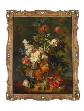 AFTER JAN VAN HUIJSUM (HUYSUM) A CROWN IMPERIAL, ROSES AND OTHER FLOWERS IN A SCULPTED URN, WITH A BIRD'S NEST ON A LEDGE Oil on panel Bears signature (lower left) 79 x 61cm (31 x 24 in.) Provenance: Henry Graves & co., London Mr. John HarrisonThe present lot is after the original painting by Huijsum, dated 1723, now in the Rijksmuseum, Amsterdam