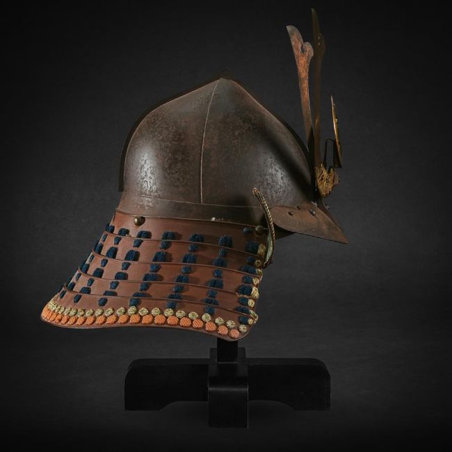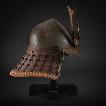 ‡  A momonari kabuto [peach-shaped helmet] Edo period, 17th - 18th century the russet iron bowl of momonari form with central raised ridge rivetted, russet iron peak, the turnbacks applied in stenciled Dutch leather, the four-tiered black lacquer neckguard gilt metal kuwagata, sun disc maedate [ornamental crest] inscribed with Sanskrit character (bonji), copper-gilt fittings The bowl to peak: 30 cm. Condition Report: The helmet bowl with slight surface rust and slight pitting in places, the turnbacks with slight wear to the edges. Please note that the lot is sold without the display stand. A stand can be ordered through the department. Condition Report Disclaimer