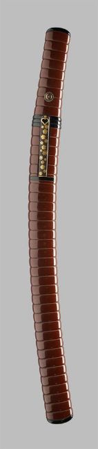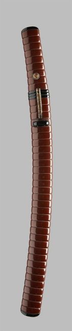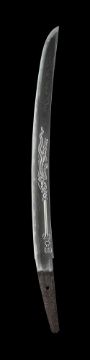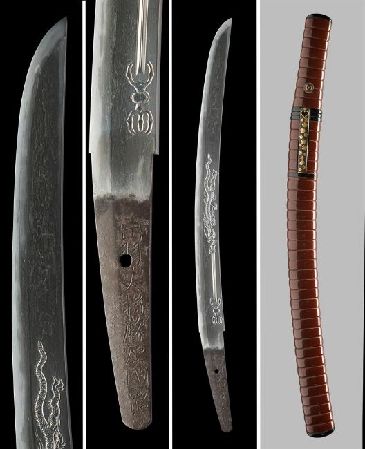 The Property of an English GentlemanA wakizashiSigned Dewa no Daijo Fujiwara Kunimichi Edo period, 17th century  Sugata [configuration]: katakiriba-zukuri, iori-mune, chu-kissaki, saki-zoriKitae [forging pattern]: densely flowing itame-hada mixed in with mokume, some nagareHamon [tempering pattern]: the omote with relatively narrow midare-ba, broad and subdued nioiguchi, profuse nie, sunagashi and clear nijuba, the ura with flamboyant midare-ba, plenty ashi, yo and sunagashi, subdued nie-laden nioiguchiBoshi [tip]: the omote with pointed ko-maru boshi and protracted kaeri, the ura midarekomiwith extended steep turnbackHorimono [carvings]: the omote with descending three-clawed dragon on suken with vajra hilt, the ura with double bohiHabaki [collar]: single clad, the shakudo habaki emblazoned with encircled sword and wood sorrel crests, the reverse with linked rings crestNakago [tang]: ubu, shallow kurijiri, o-sujikai, one mekugi-anaKoshirae [mount]: mounted in a Higo-style koshirae with fine red and black lacquer ichibu-kizami saya, silver and copper-gilt mekugi in the form of chrysanthemums, the iron kozuka with Hosokawa cherry blossom and kuyo mon [Nine Luminaries crest], the iron kogai inlaid in gold withscrolling karakusa, (maru ni ken katabami mon), 65 cm. longNagasa [length from kissaki to machi]: 47. cm.Moto-haba [width at the machi]: 3.9 cm. Condition Report: The blade in good polish, the lacquer koshirae with some minor surface wear, including slight chips, dents and minor scratches, the tsuka with a slight dent, the kogai with slight chip to the point. Condition Report Disclaimer