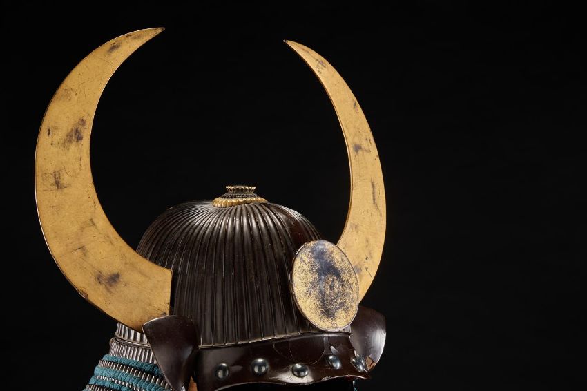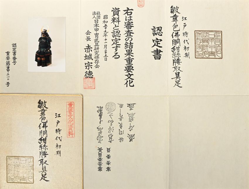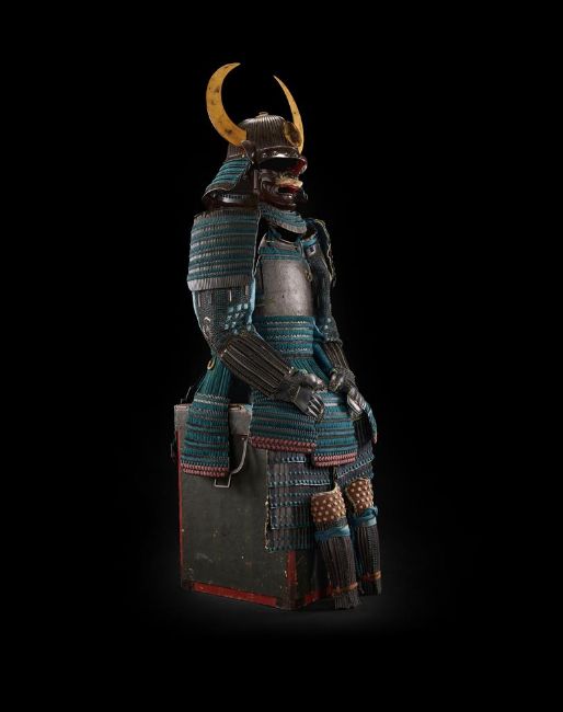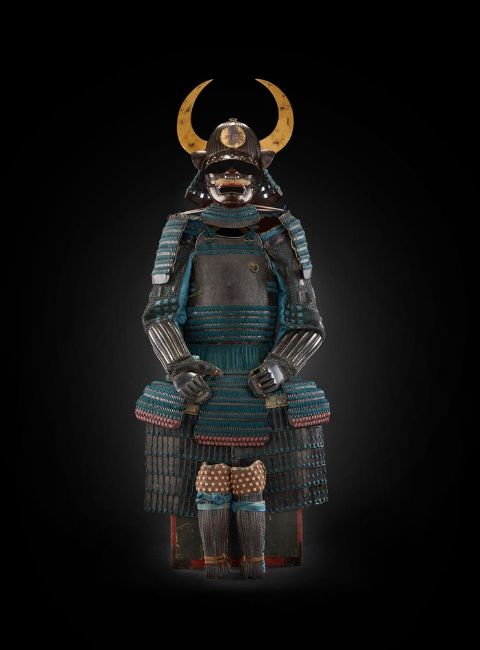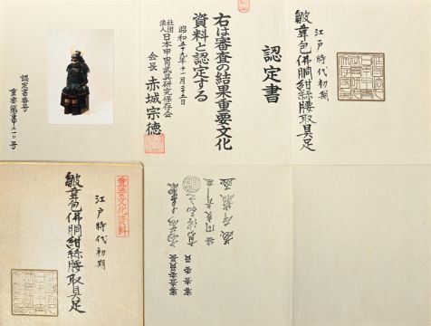 ‡  The Property of a Gentleman A nimai-do gusoku [armour]Edo period, 17th century Kabuto [helmet]:the sixty-two plate black lacquered iron bowl with raised ridges, terminating in a five-stage copper-gilt and shakudo tehen kanamono, black lacquer peak and turnbacks, the peak with seven large circular rivets, four-tiered black lacquered neck guard with close-spaced lacing in blue-green braid, gold lacquered sun disc maedate [ornamental crest] and kuwagata wakidate [lateral crests in the form of stylised horns] Mempo [face mask]:the ressei mempo [face mask with fierce expression] with yak hair moustache, detachable nose-plate, silver lacquer teeth, red lacquer three-tiered throat protector Do [cuirass]:the cuirass hinged in two pieces and mounted in leather, silver fukurin, copper-gilt fittings, seven tassets of five-tiered kusazuri Sode, kote [shoulder guards and sleeves]:five-tiered black lacquer shoulder guards, chainmail kote with blue silk brocade lining of later date Haidate, sune-ate [thigh protectors and shin guards]:black lacquer thigh protectors with silk brocade edging, shin guards (shino suneate), all components laced in matching braid Accessories:surcoat (jinboari) linen in pale blue weave Accompanied by a certificate of registration as Juyo Bunka Shiryo [Important Cultural Material], no. 310 issued by the Nihon Katchu Bugu Kenkyu Hozon Kai [Society for the Preservation of Japanese Armour], dated Showa 54 (1979). Condition Report: Overall in good condition with some sold wear to cuirass and the lacquer of the kabuto, the black lacquer iron bowl with some small chips, slight lifting of lacquer around the mount for the maedate, the peak with some areas of cracking and lifted lacquer, the turnbacks worn with slight chips, overall the brocade is in good condition with some slight marking, the leather cuirass with a small areas lifting to the front, the silk and Dutch stenciled leather to the skirt slightly worn in places, as can be seen in the illustration there is slight rubbing to gold lacquer of the maedate and wakidate revealing the black lacquer beneath.  Condition Report Disclaimer