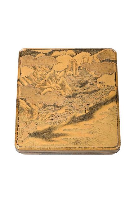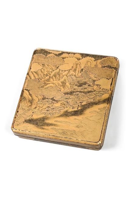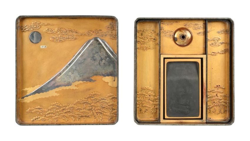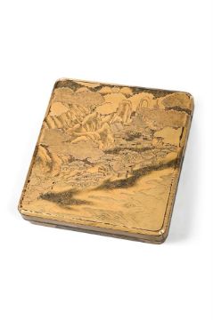 ‡  Property from the Collection of Jean SaportaA suzuribako [writing box]Edo period, 17th century the rectangular box with overhanging cover, canted edges and corners, decorated in gold and black hiramaki-e, takamaki-e, kimpun, hirame, kirikane and silver foil on a nashiji ground, depicting a mountainous landscape with a temple on the shore of a lake, the three peaks of Mount Fuji visible in the distance, the design continuing onto the sides, the interior of the cover with Mount Fuji beneath clouds in moonlight, pine trees to the foreground, all on a kinji ground, silvered rims, fitted with two brush trays, copper gilt water dropper and associated ink stone with fundame rims 21 x 19.4 x 4.2 cm. Provenance:Private collection (labelled "145.2" on the interior of the cover) Condition Report: The cover worn with small pieces of gold foil lacking, commensurate with the age and use of the box, there is old wear to the canted edge of the cover, the striking design of Mount Fuji in silver to the interior of the cover with a small paper label attached, the inkstone associated.  Please note the water dropper in this lot is not silvered. It contains copper gilt water dropper.Condition Report Disclaimer