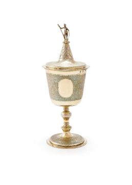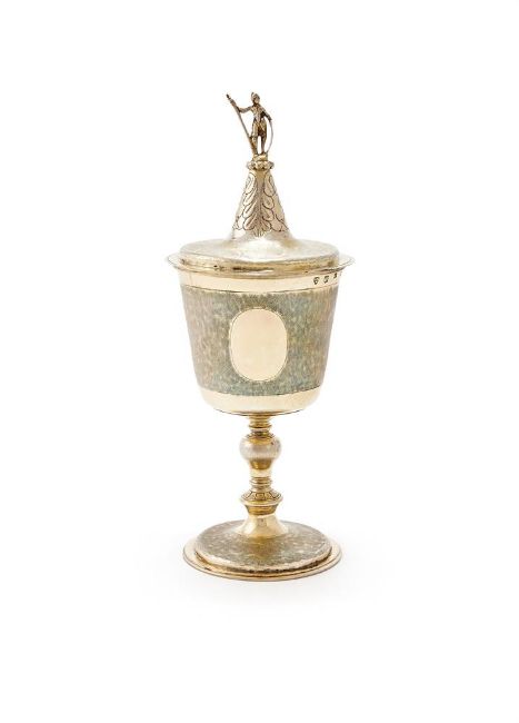 A COMMONWEALTH SILVER GILT STANDING CUP AND COVER MAKER'S MARK WM OVER FOUR BALLS ARRANGED IN A SHIELD, LONDON 1650 The conically domed cover chased with leaves and a warrior finial, the body with pounced borders and two oval vacant reserves, a knopped stem to a shallow domed foot 34.5cm high 889g (28.6 oz)  See Jackson's Silver & Gold Marks of England Scotland & Ireland, edited by Ian Pickford, page 118 for a listing of the maker's mark Offered for sale with a letter from the London Assay Office dated 10th September 2025 stating: The cup and cover... was examined by the Goldsmiths' Hallmarking Authentication Committee.... The Committee is of the opinion that this cup and cover is hallmarked in accordance with the Hallmarking Act 1973. Provenance:Formerly from the collections of George Wilbraham and later William Randolf Hearst, The Wild Collection, Sotheby's, London, 24 March 1960 The Davies-Cooke Collection from Gwysaney Hall, North WalesFor further details about the collection, visit: www.dreweatts.com/news-videos/gwysaney-hall-a-welsh-family-s-portrait-of-british-history-14767/ Condition Report: Marks are clear.The cover and body have been completely re-gilded. The gilding is also on the underside of the cup.Around the top band of the cup, where the hallmarks are struck, there is evidence of engraving that has been removed and regilded. The two oval panels to the body appear to be original and not let in. There is a possibility that previous engraving has been removed, but this is difficult to tell. There are no obvious signs of solder repair to the cup. We are unable to confirm if the engraved decoration is original to the piece. Signs of a fault to the stem with a potential split. There is a section to the stem that may have been a possible repair and gilded over.The finial to the cover may not be original to the piece. The shield is probably a replacement or has been heavily polished, with signs of clumsy solder to the top and bottom. There is solder to the feet of the figure and been reattached. The spear has been reattached with clumsy solder. Splits to the spear.Slight fold to the cover rimLight scratches and wear commensurate with age and use.Please request for additional images relating to the condition.  Condition Report Disclaimer