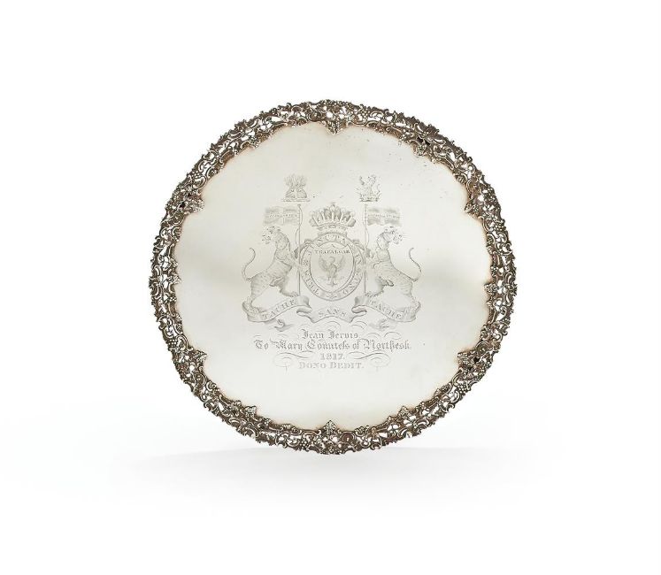 A GEORGE II SILVER SHAPED CIRCULAR TEA TRAY MAKER'S MARK OBSCURED, LONDON 1751 With a pierced and chased grape vine and scroll border, the separate polished centre plate later engraved with an armorial of an eagle displayed azure and armed sable, charged on the breast with a naval crown of the field, surmounted in chief by 'TRAFALGAR' (Carnegie) with one crest of the stern of a French Man-o-War with three lanthorns all proper inflamed gules, on a scroll the word 'TRAFALGAR', and a second crest, issuant from a Naval crown or, a demi leopard proper, holding a rose argent, barbed and seeded vert, on a scroll the words 'BRITANNIA VICTRIX, supported by two leopards reguardant proper, gorged with a rose argent, barbed and seeded vert, each supporting a banner of St George proper, charged with 'BRITANNIA VICTRIX', and the Grand Cross of the Bath, above the dedication' Jean Jervis, to Mary Countess of Northesk, 1817, Dono Dedit' The centre plate with standard and London assay marks only to the back 56cm diameter2861.8g (92.1oz)Fitted with a later wooden backing This is the extensive armorial of William CARNEGIE GCB (1756-1831) 7th Earl of Northesk in the Peerage of Scotland, who married Mary RICKETTS in Paris in 1788. William had a distinguished naval career and was third in command at the battle of Trafalgar on HMS Britannia. He was made a Knight of the Bath in 1806 for the part he played at Trafalgar. Alongside his later career in finance and politics, William's commitments to the navy continued when he was awarded the position of Rear-Admiral of the United Kingdom in 1821, and Commander-in-Chief at Plymouth from 1827 - 1830.William's wife Mary Rickets was daughter and heir of William Henry and Mary RICKETTS of Longwood, Hampshire. Mary Rickett's maternal uncles were John JERVIS (1735-1823), 1st Earl St Vincent and Admiral of the Fleet, and William JERVIS (1728-1771) whose wife was Jane Jervis (nee Hattrell 1733-1817). William and Jane Jervis had no children, and in her will of 1817 Jane bequeathed certain items to Mary Ricketts, Countess of Northesk, including ' ... to say to the Countess of Northesk my large silver tea salver or tea tray'. The dedication 'Jean Jervis' in the engraving might be a scribe or engraver's error as Jane, Jene and Jean were common variants of the same name in the early 19th century.Provenance:Property From The Family of The Earls of Northesk   Condition Report: Please note that Dreweatts removed the wooden back to obtain the weight and to examine the standard and town marks only that are stamped to the back of the plate. The wooden back has been put back in to give strength to the plate, due to the plate being very thin and 'whippy'The later engraved armorial is exceptionally fine and crisp. It does not appear to have been previously engraved.The crimping holding the wooden back in place is crude, lifted in areas and exhibits previous repairs.Partial obscured marks to the crimped edge are worn and splitThe back of the fruit vine border exhibits numerous repairs with at least two patches and old solder. Signs of clumsy repair to the front of the border as well. There are no feetNo significant creases or dents Light scratches and wear commensurate with age and usePlease refer to all additional images to the repairs and damage. All potential bidders are deemed to have examined and accepted all damage shown in the images prior to bidding.  Condition Report Disclaimer