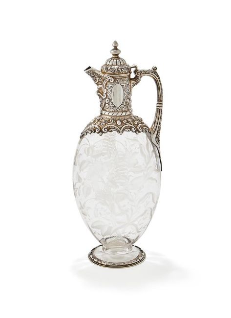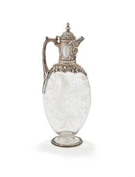 A VICTORIAN PARCEL GILT SILVER MOUNTED STOURBRIDGE GLASS CLARET JUG CHARLES EDWARDS, LONDON 1888 With a cone finial to the domed cover, a leaf capped handle, chased with floral sprays, C-scrolls and a grotesque mask, the ovoid body cut with ferns and foliage 32.5cm high