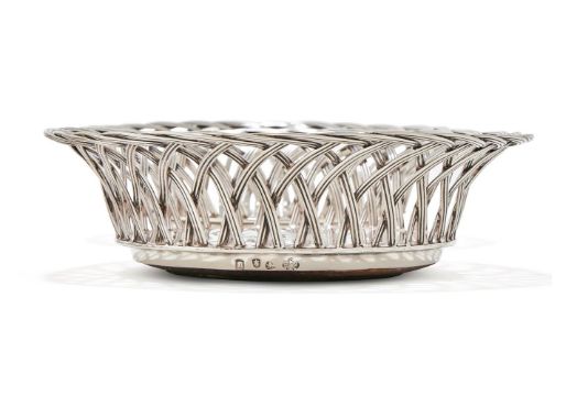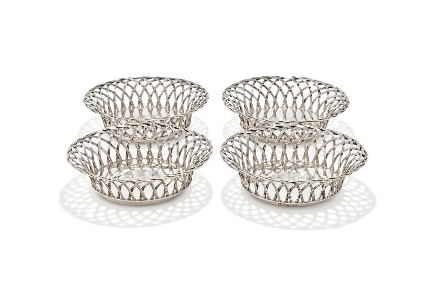 A SET OF FOUR GEORGE III SILVER WIREWORK COASTERS JOHN LAWFORD & WILLIAM VINCENT, LONDON 1764 Engraved with an armorial 18.5cm diameter With wooden basesThe shield appears to be associated with the arms of the GAIL(L)E family. Genealogically the name appears amongst families in Ireland, and in particular later in Northern Ireland. As there is also no record of a grant of arms to the family, these arms are likely to be assumed.