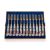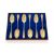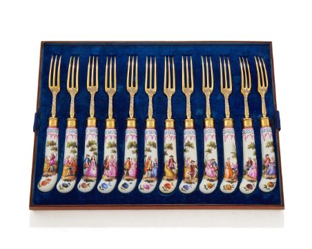 A CASED VICTORIAN SILVER GILT DESERT SERVICE GEORGE ADAMS FOR HENRY CHAWNER, LONDON 1865 AND 1872 Comprising:Six serving spoons Twelve dessert spoons 783g (25.15 oz) Together with the following with Dresden painted porcelain handles:Twelve dessert forks Twelve dessert knives In a fitted wooden box