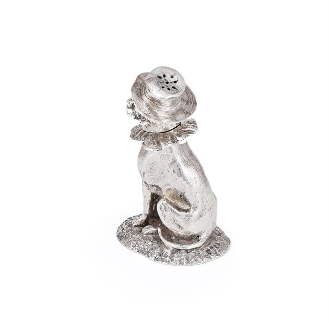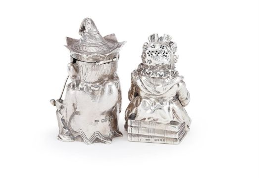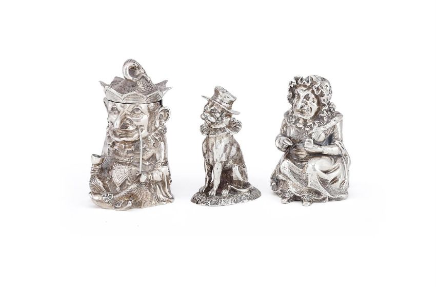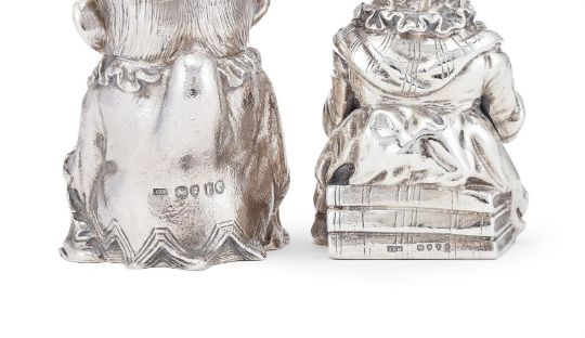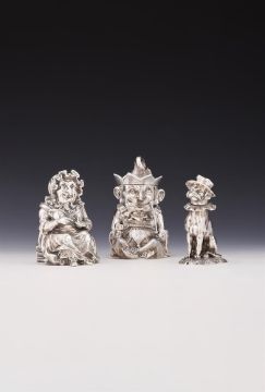 A VICTORIAN SILVER NOVELTY THREE PIECE CRUET SET JAMES BARCLAY HENNELL, LONDON 1880 (1) AND 1886 (2) The salt modelled as Toby, 8cm (3 1/4in) high, the pepperette as Judy, 9cm (3 1/2in) high and the mustard as Punch, 10cm (4in) high 494g (15.9 oz) Provenance: Private Collection Condition Report: Punch - Marks are clear, slight play to the hinge, no spoon, cover sits well, dent to the base, some rubbingJudy - Marks are clear, cover to base screws down well, stands well, some rubbingToby - Marks to base clear, marks to cover partially obscured, cover fits with playAll with light scratches and wear commensurate with age and useCondition Report Disclaimer