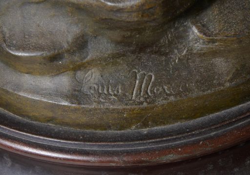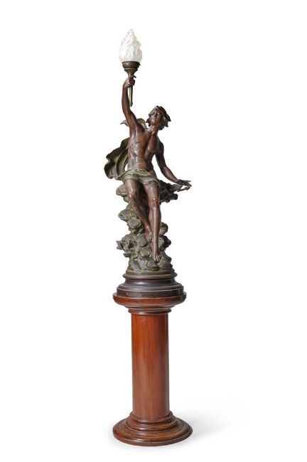 AFTER LOUIS MOREAU, A PATINATED SPELTER FIGURAL LAMP 'LE GENIE DE LA LUMIERE' LATE 19TH CENTURY Young male figure holding aloft a torch in his right hand, glass flambeau shade, a drape across his lap and round his back, seated on clouds with thunderbolt, moulded circular base, signed to cast ; together with a modern pedestal stained as mahogany approximately 139cm high, the pedestal 76cm high Provenance: By repute, Cork Opera House Private Collection, Swiftsden House, East Sussex Condition Report: Please note a condition report for this lot has not been completed and is available upon request.Condition Report Disclaimer
