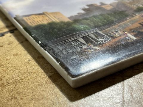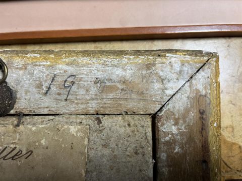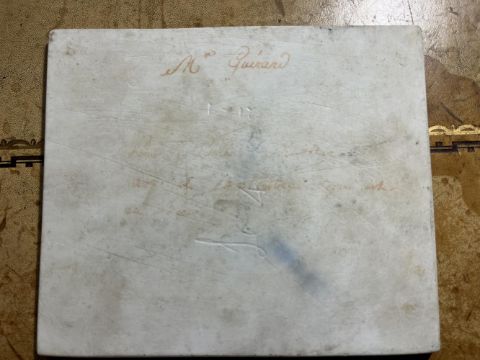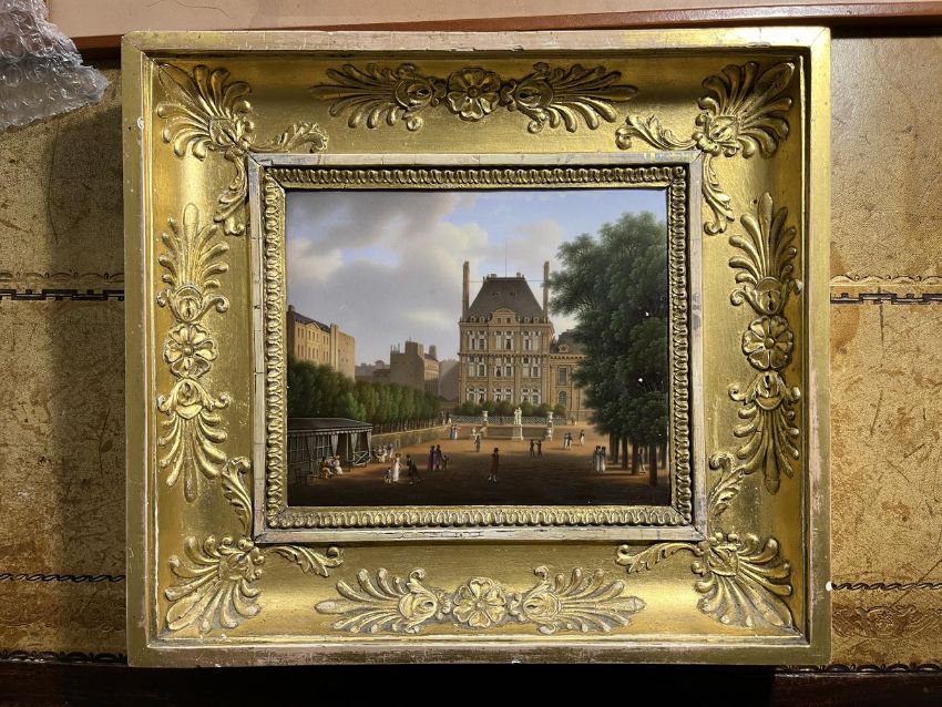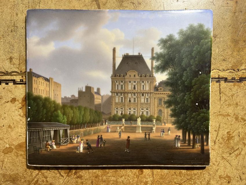 A SEVRES HARD PASTE PORCELAIN TOPOGRAPHICAL PLAQUE 'THE TUILERIES GARDENS' DECORATED BY M. GUERARD, 1822 Porcelain signed and dated to lower right corner and further inscribed to reverse "Mr Guirard", further illegible inscription below "*** Tuileries***", incised "Le 4 21-1", two printed blue factory marks, in period frame, with paper labels to reverse "Mrs Miller", "View of the Pavilion ** Marsan Palace of the Tuileries. From the Royal Porcelain Manufacturer at Sevres" the plaque 14cm x 16.5cm, the frame 24 x 27cm Provenance: Selected items from a Private Collection, Norfolk The decorator is listed in "The French Porcelain Society Sèvres Workman's List", compiled by Tamara Preaud, archivist, Manufacture Nationale de Sèvres, 2003. Condition Report: The plaque with 4 small enamel flakes within foliage of trees (to right and left edges), slightly raised surfaces at these points, signature obscured by frame and slightly difficult to read, small edge wear and rubbing and some surface dirt. Frame with rubbing and losses commensurate with age, regilt and old hanging holes and marks Condition Report Disclaimer