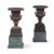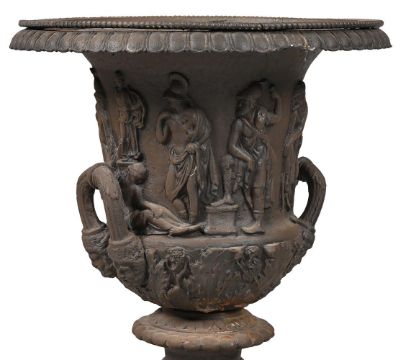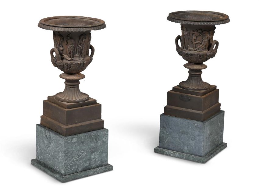 A PAIR OF HANDYSIDE CAST IRON TWIN HANDLED 'BORGHESE' AND 'MEDICI' VASES LATE 19TH CENTURY Relief cast with continuous band of classical figures, square bases, one with plaque 'A. Handyside & Co. Limited, London and Derby' the urns 63.5cm high, tops 40cm diameter, bases 27.5cm square Set on variegated green marble plinths, 25.5cm high, bases 36cm square overall height 89cm Provenance: Private Collection, Swiftsden House, East Sussex Saleroom Notice: Please note, the measurements for this lot have been updated and differ from the printed catalogue Condition Report: Saleroom Notice: Please note, the description has been updated and differ from the printed catalogue. urns 63.5cm high, tops 40cm diameter, bases 27.5cm square Set on variegated green marble plinths, 25.5cm high, bases 36cm square overall height 89cm With historic wear. Look to have had paint removed, cleaned and urn tops reattached to stems within last 30 years. One junction point has failed between a top and stem which will require remedial work before future use. With beginnings of surface rust and signs of older rust. Water stains to stem junction points. Interiors with old attrition wear. Same urn has also had historic break to section of separate top rim mount. Neither is attached to metal plinth bases, Marble with scuffs and edge nibbles. Please see additional images for visual references to condition which form part of this condition report. All lots are available for inspection and Condition Reports are available on request. However, all lots are of an age and type which means that they may not be in perfect condition and should be viewed by prospective bidders; please refer to Condition 6 of the Conditions of Business for Buyers. This is particularly true for garden related items. All lots are offered for sale "as viewed" and subject to the applicable Conditions of Business for Buyer's condition, which are set out in the sale catalogue and are available on request.Condition Report Disclaimer