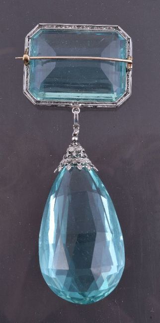 An impressive Edwardian aquamarine and diamond brooch, the pediment with a step cut aquamarine with canted corners, estimated to weigh 87.82 carats, within a millegrained surround of eight cut diamonds, approximately 0.76 carats total, suspending a large briolette aquamarine drop, 5.4cm long, with a banded and pierced scrolled rose cut diamond set cap, suspended from a rose cut diamond bale, total length 10.8cm long, 70.7g gross Provenance: Nancy Witcher Langhorne was born in Danville, Virginia, into a moderately successful railroad business family and she married her first husband, Robert Gould Shaw, at the age of 18 in 1897. The marriage was not terribly successful and it ended in divorce in 1903, after which Nancy made her first tour of Britain and fell in love with the country. She took the advice of her father and along with her sister Phyllis moved to Britain permanently in 1905; here her wit and intelligence were much admired throughout the upper echelons of British society. In 1906 Nancy married fellow American-born Waldorf Astor, having met the previous year on an Atlantic sea crossing.Nancy and Waldorf were given Cliveden House in Buckinghamshire as a wedding present by Waldorf's father, William Waldorf Astor, 1st Viscount Astor. Cliveden became a major centre for the elites of Edwardian and inter-war society under Nancy and Waldorf, and was renowned for entertaining politicians, writers, academics and film stars. Nancy also received the pale yellow, 55.23 carat, Sancy Diamond as a wedding gift from Viscount Astor. The historic, centuries old stone was reputed to have come from India, due to its unusual faceting, and at different times in its long and rich history had been owned by French and British sovereigns and Russian and Indian nobility. In 1978 the 4th Viscount Astor sold the Sancy Diamond to the Louvre for US $1m. In 1910 Waldorf Astor was elected to Parliament as MP for Plymouth; a seat he held until 1919, when he was elevated to the peerage following the death of his father, becoming Viscount Astor and taking his seat in the House of Lords. Waldorf's Plymouth seat became vacant, and his wife, Nancy, decided to contest the seat. Lady Astor was subsequently elected to Parliament in the bi-election of 1919, and took her seat in Parliament on 1st December 1919, and held the seat for 26 years until her retirement in 1945.This Edwardian jewel has been consigned to auction by Nancy Astor’s great granddaughter, to whom it was left in 1977. The brooch has rarely been seen or worn since then, and has remained, nestled in tissue paper, in a box from Sullivan Powell & Co. Ltd, purveyors of exotic and oriental cigarettes, formerly of Burlington Arcade, London W1. It is fitting that the brooch offered here celebrates Lady Astor's achievement 100 years ago in becoming the first woman MP to take her seat in the Commons, although she was in fact the second woman to be elected to Parliament.