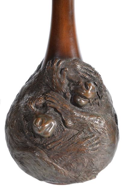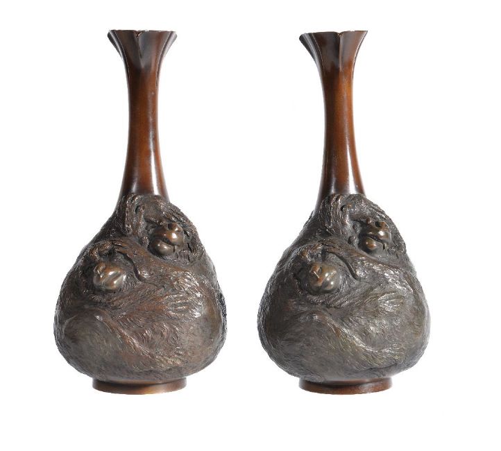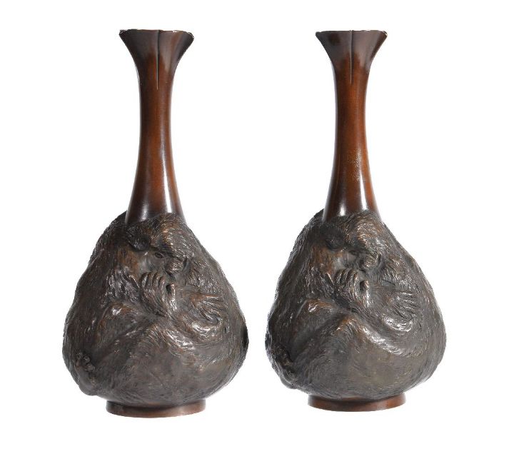 A Pair of Japanese Bronze Vases, each of bulbous form cast in high relief with the Sanbikisaru or Three Wise Monkeys, each covering the appropriate sensory organ of its companions, the vases rise to a cylindrical neck with everted, tri-foliate mouth, height 28.9cms, each illegibly inscribed to base, Meiji Period (2)