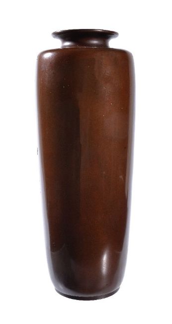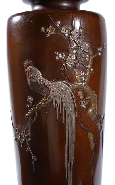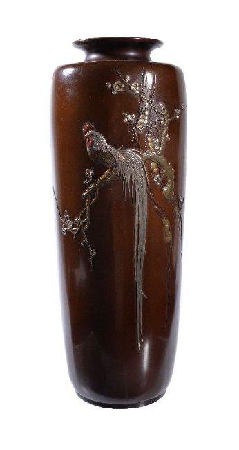 A Tall Japanese Bronze Vase, of cylindrical form resting on a short foot and rising to a short cylindrical neck with everted mouth, decorated in relief, kebori, silver, copper, shibuichi and gold taka-zogan with a long-tailed cockerel perched on the branch of a prunus tree, height 36cms, Meiji Period