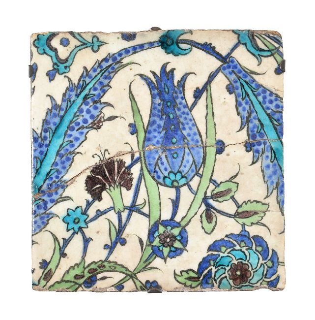 A Damascus glazed polychrome fritware tile, Ottoman Syria, late 16th century, with a design of flowers amidst scrolling Saz leaves, 23cm x 22.5cm, mounted for wall hanging Compare with a similar example, illustrated, Arthur Millner, Damascus Tiles, London, 2015, fig 6.90, page 281 and another example in Leighton House. Provenance: From the Estate of the late Sir Howard Hodgkin CH CBE.