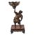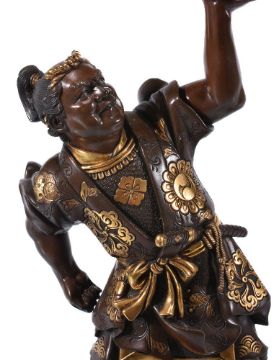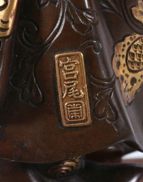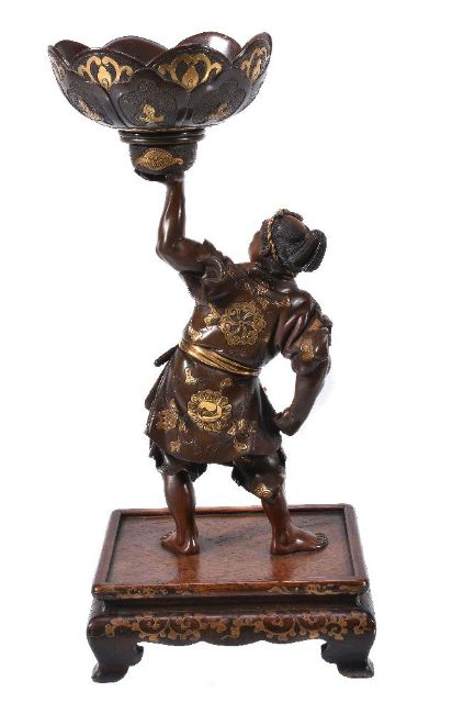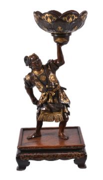 Miya-O Eisuke: A Bronze Figure of Man, dressed with a loose robe over a kesho-mawshi, a tanto tucked through his sash, he holds a large circular bowl decorated to the exterior with lappets in his left hand, details in gilding, the face finely modelled, signed on a gold plaque Miya-o with seal Ei; the figure stands on a typical lacquered wood stand, height overall 30.5cms, Meiji Period
