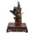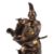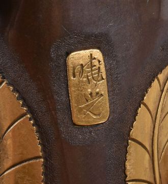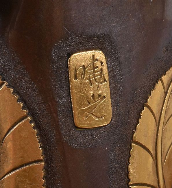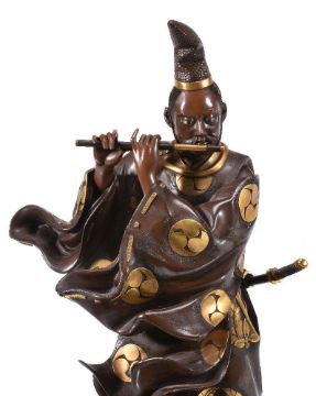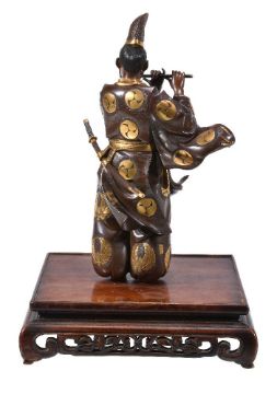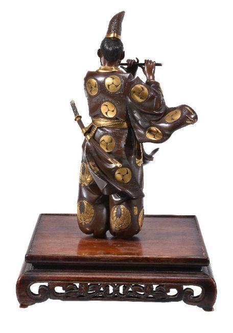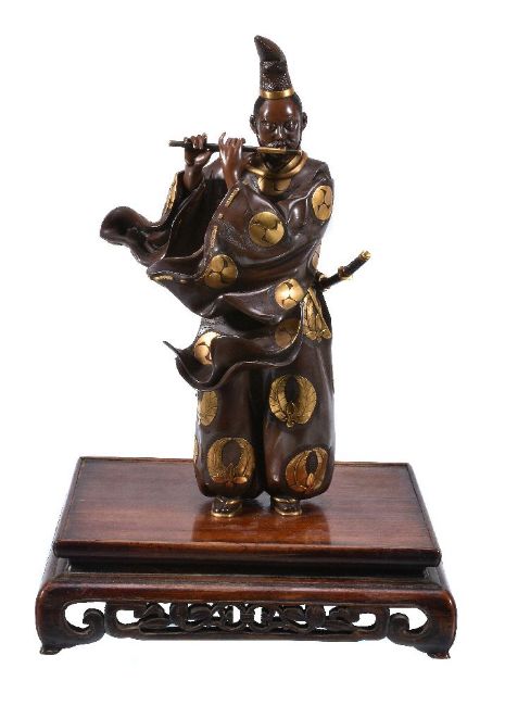 A Japanese Parcel Gilt Bronze Figure of Fujiwara no Yasumasa, he stands wearing his court cap and flowing robes, his tachi hangs from his belt as he plays on his flute, details are picked out in gilding and black, signed on a gilt panel to one side () mitsu; affixed to wood stand with pierced and carved frieze, height overall 35cms, Meiji Period
